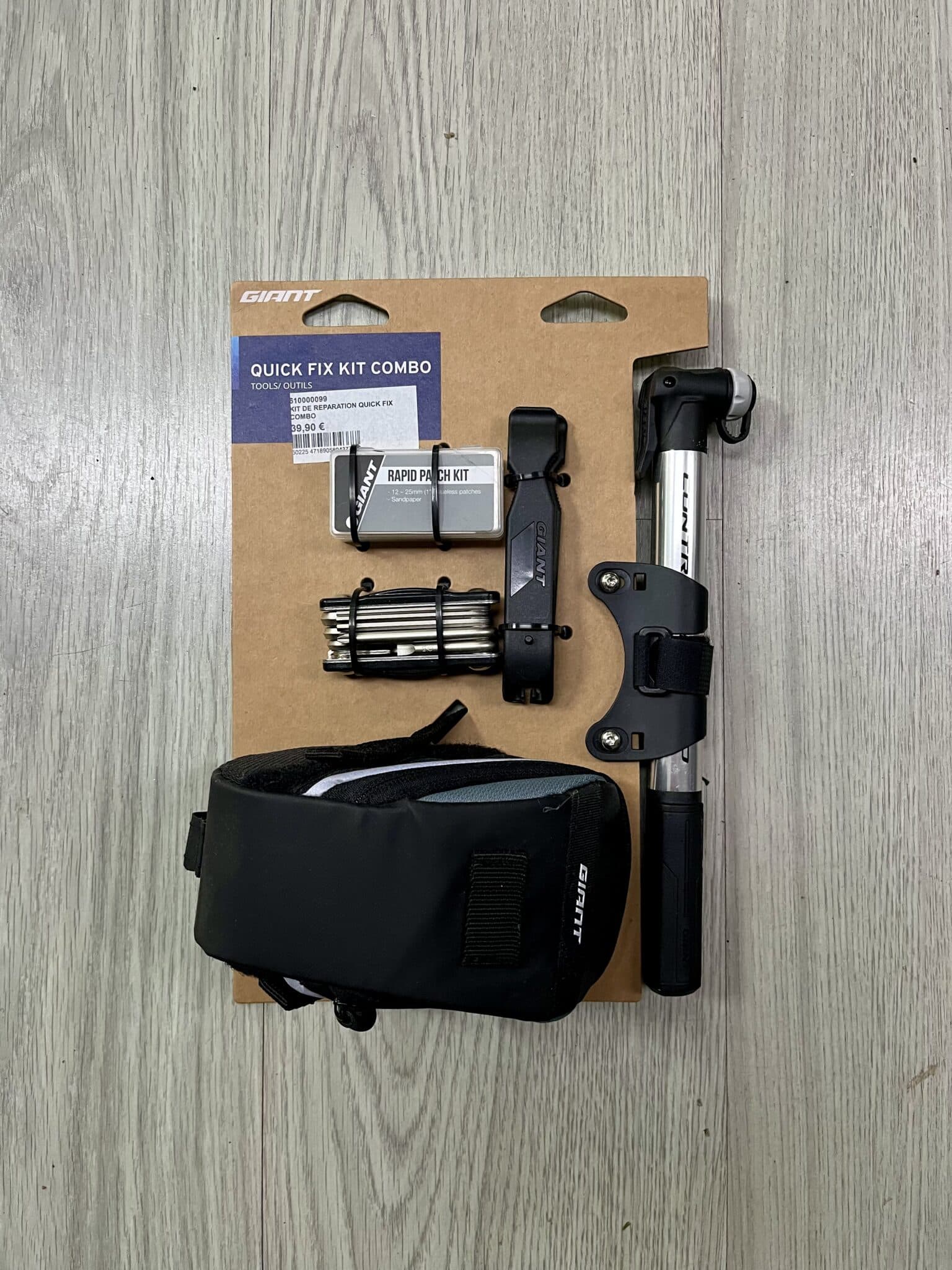 le combo Quick Fix comprend une sacoche de selle, une mini-pompe, un outil multifonction, des démonte-pneus et un kit de réparation de pneus.