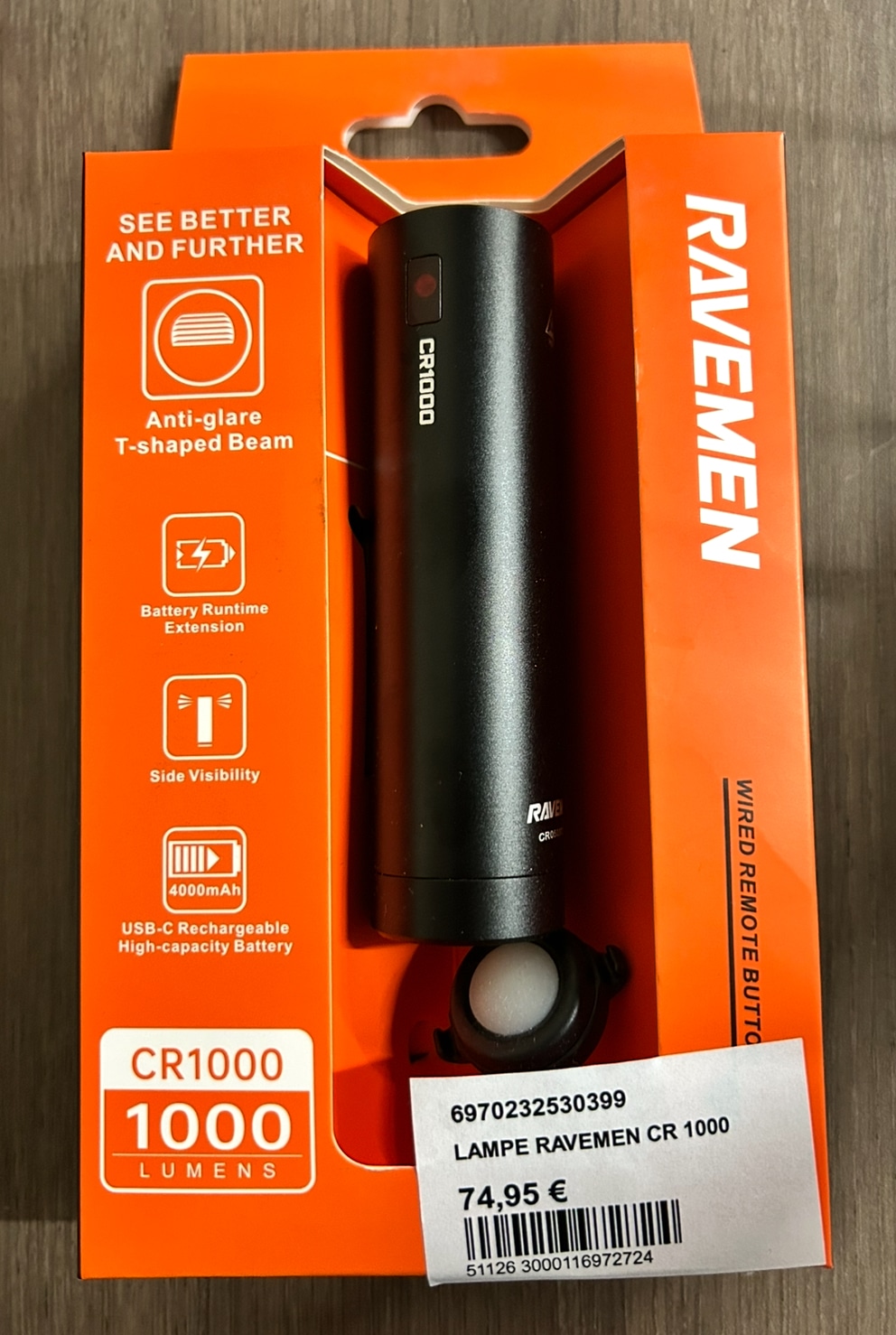 Avec une grande batterie de 4000 mAh et un maximum de 1000 lumens, le CR1000 est conçu pour les cyclistes sur route qui roulent la nuit à grande vitesse et sur de longues distances. Doté de la nouvelle lentille optique anti-éblouissement RAVEMEN, le CR1000 crée un faisceau en forme de T, éclairant la route avec un projecteur pour une distance rapprochée et un projecteur lumineux pour une distance éloignée sans éblouir les autres usagers de la route. Avec l’extension de la durée de fonctionnement de la batterie, le CR1000 peut également être utilisé pour la conduite et la course sur de longues distances.